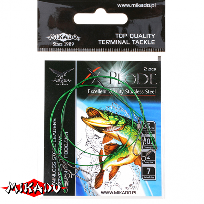 Каталог » ОСНАСТКА » Поводки » Поводки Mikado » Арт.ZG11-001 Поводок X-Plode "Mikado" стальной (уп.2 ) застёжка №2, 2-а вертлюга №7, зелёный, 10кг / 25см (ZG11-001)