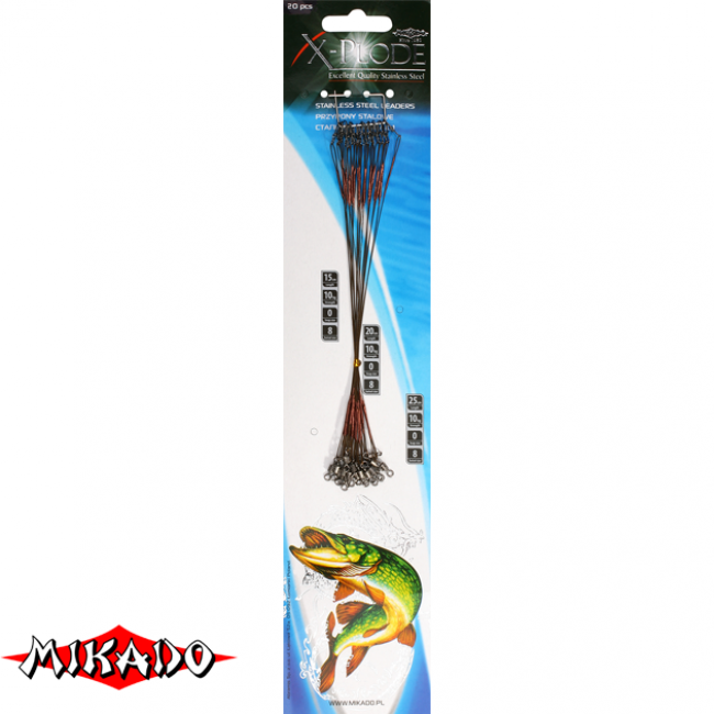 Каталог » ОСНАСТКА » Поводки » Поводки Mikado » Арт.ZG11-031 Поводок X-Plode "Mikado" стальной многожил. (уп.20 ) застёжка №0, вертлюг №8, 10кг / 15см (ZG11-031)