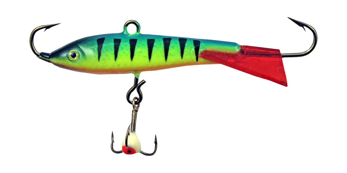 Зимний балансир для ловли окуня. Балансир оснащен впаянными крючками - ""KAMASAN"" и подвесным тройником ""MUSTAD""