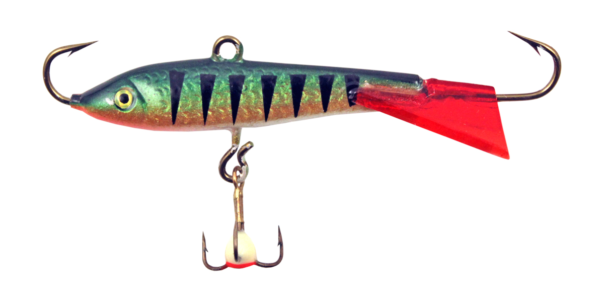 Зимний балансир для ловли окуня. Балансир оснащен впаянными крючками - ""KAMASAN"" и подвесным тройником ""MUSTAD""