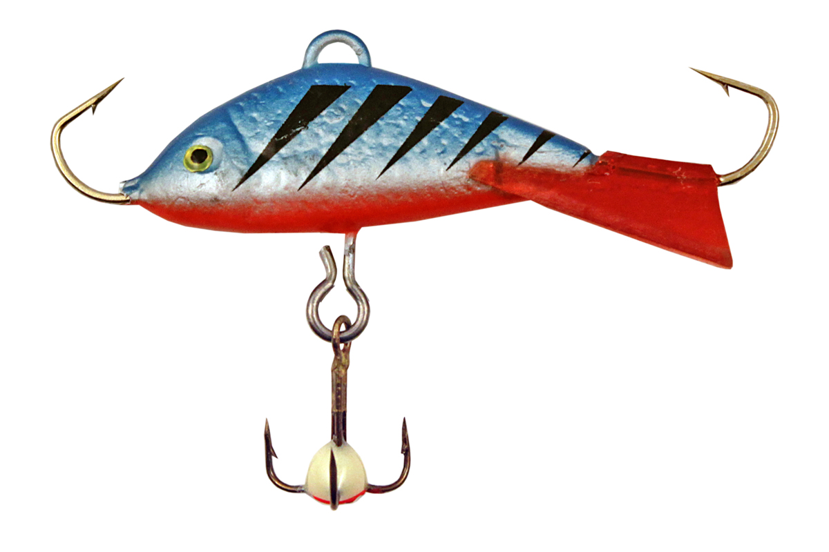 Зимний балансир для ловли окуня. Балансир оснащен впаянными крючками - ""KAMASAN"" и подвесным тройником ""MUSTAD""