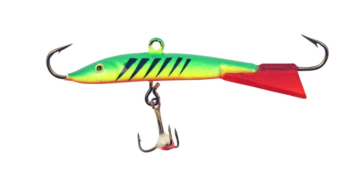 Зимний балансир для ловли окуня. Балансир оснащен впаянными крючками - ""KAMASAN"" и подвесным тройником ""MUSTAD""