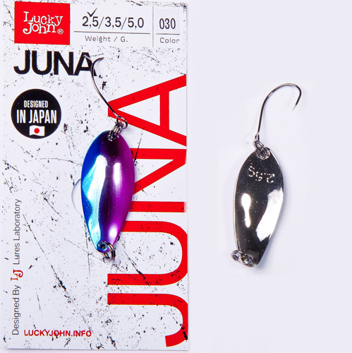 JUNA/вес 5,0г/расцв.030 Lucky John JUNA - серия колеблющихся блесен для ультрала- и лайтовой спиннинговой ловли форели. Эти блесны соответствуют всем требованиям , предъявляемым к приманкам для ловли форели на платных, а так же для ловли рыбы в естественных водоемах и речках со средним течением и с небольшими глубинами.