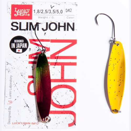 SLIM JOHN/вес 2,5г/расцв.042 Lucky John SLIM JOHN - серия колеблющихся блесен для ультрала- и лайтовой спиннинговой ловли форели. Эти блесны соответствуют всем требованиям , предъявляемым к приманкам для ловли форели на платных, а так же для ловли рыбы в естественных водоемах и речках со средним течением и с небольшими глубинами.