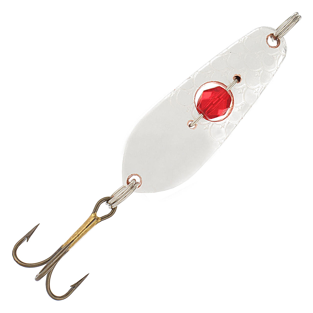 Узенький профиль и толщина блесны дает возможность удачно использовать ее в речных критериях. Особый шарик-бусинка, расположенный в корпусе блесны, переливаясь своими гранями в прозрачной воде, срабатывает, как дополнительный раздражающий фактор для атаки.