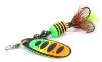 Вращающиеся блесны Synchrony от бренда Pontoon21 выполнены в классическом стиле и имеют традиционную компоновку. Лепесток приманки имеет эффектную двухстороннюю реверсивную окраску, которая позволяет создать очень привлекательный визуальный эффект во время проводки. Красивое мелькание лепестка хорошо заметно для хищника и провоцирует его на атаку. Для усиления визуального эффекта блесна имеет мушку, расположенную на тройнике. Цилиндрический сердечник имеет смещенный к головной части центр тяжести. Эта особенность придает приманке отличную устойчивость на проводке. Над сердечником расположены маленькие стальные шарики и конус, которые выполняют роль своеобразных подшипников и обеспечивают лепестку Synchrony стабильное и легкое вращение. Блесны Pontoon21 Synchrony ловят различных хищников как на водоемах с течением, так и без него.