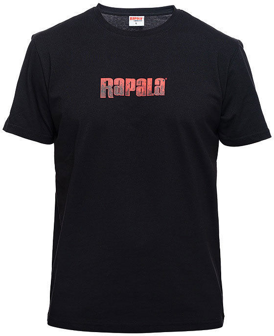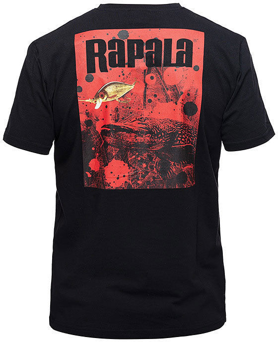 Футболка Rapala logo Splash р.XL Чёрная хлопковая футболка Rapala с логотипом на груди и изображением щуки, преследующей приманку Super Shadow Rap на спине.