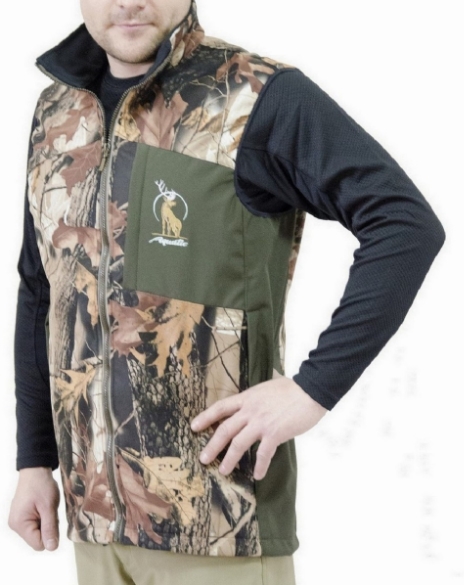 Жилет из материала Soft-Shell создан для защиты от ветра. Нагрудный карман на молнии с логотипом. Боковые карманы незаметные снаружи и вместительные внутри. Регулируемая ширина по низу. Светоотражающие накатки по бокам молнии. Комбинированные вставки из ткани расцветки камуфляж придают отличительную особенность жилетам. У жилета есть вышивка: логотип Олень - для охоты. Оптимальная защита от непогоды и максимальный комфорт.