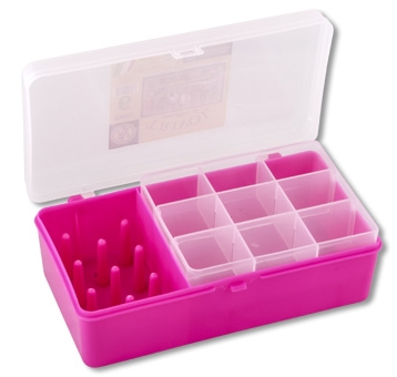 Коробка "Тривол" ТИП-6 Количество ячеек в нижней части коробки - 3, во вкладыше две съемные перегородки, всего - 9 ячеек. Комплектация: 1. Основание 2. Крышка 3. Вставка 4. Два отсека : а) с патронодержателем для катушек с нитками, б) для швейных принадлежностей и мелочей. Д 21 х Ш 11 х В 6,5 см. Материал: пластик