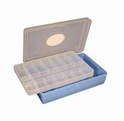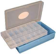 Прозрачная крышка, через которую отлично видно содержимое. Имеет второю съемную полку с ячейками небольшого размера. Не разъедается твистерами.