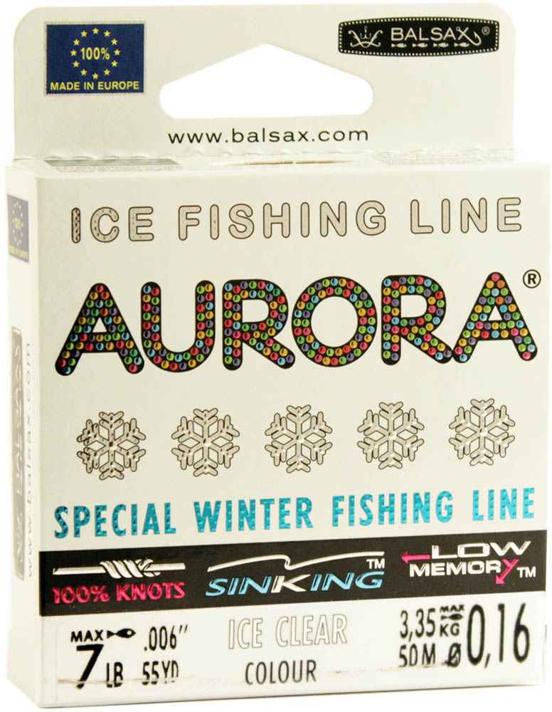 Леска "Aurora" - создана специально для зимней ловли. Очень хорошо выдерживает низкую температуру. Поверхность обработана таким образом, что она не обмерзает как стандартные лески. Отлично подходит для подледного лова. А прозрачный цвет гарантирует, что она практически незаметна даже в кристально прозрачной воде. В самом холодном климате, при температуре до -40, она сохраняет свои свойства.