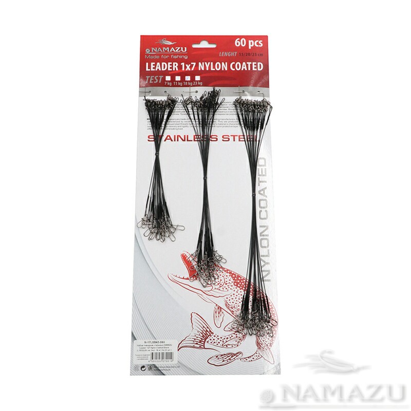 Каталог » ОСНАСТКА » Поводки » Поводки Namazu » Набор поводков стальных NAMAZU Leader 1х7 Nylon Coated Black, L-15/20/25 см, test- 11 кг (по 20 шт.)