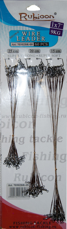 Каталог » ОСНАСТКА » Поводки » Поводки Rubicon » Набор стальн. поводков RUBICON нерж. 1x7 12kg, 15,20,25cm, Brown (Nice snap/Rolling swivel) 3x20шт