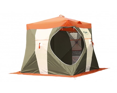 Дизайн палатки - характерный для линейки зимних палаток Митек: ярко-оранжевый купол и чередование светлых и темных цветов внизу.