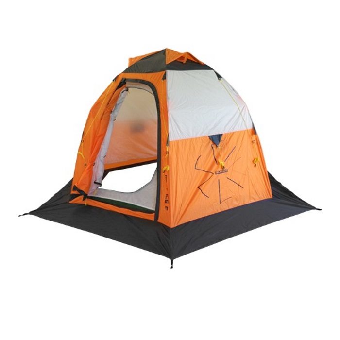 На каждом входе расположено окно с сеткой, шторками можно регулировать освещенность внутри палатки, полностью открыв или закрыв их. Вентиляционные отверстия сверху палатки при необходимости можно закрыть. Внутри палатки, на стенках, расположены 4 кармана для рыболовных мелочей. Снизу, по периметру палатки – снегозащитная юбка – полог. Для надежного закрепления палатки на льду используется прилагаемый комплект растяжек и крючков.