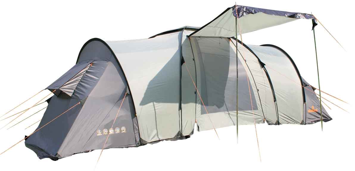 Тент: 100% полиэстер 75D/190T PU 5000 мм в ст Внутр. палатка: 100% дышащий полиэстер Д но: армированный полиэтилен (tarpauling) Каркас: HQ FiberGlass9,5/11 + сталь 16 мм Количество мест: 4 (6) Двухслойная кемпинговая палатка с двумя входами, большим тамбуром Внешний тент палатки устойчив к ультрафиолетовому излучению Входы всех спальных отделений продублированы москитной сеткой Тент палатки оборудован юбкой Два спальных отделения Два больших вентиляционных окна Все швы проклеены Съемный пол из tarpauling Монтажные элементы (угловые стропы с люверсами) внутренний палатки и тента выполнены в ярких цветах, для быстрого обнаружения в траве. Кармашки для мелочей, крючок для фонарика, Оттяжки со светоотражающей вставкой Кармашки для оттяжек. Удобные пряжки для регулировки длины оттяжки.