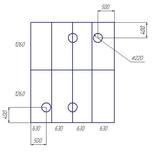 Одно отверстие диаметром 220 мм, расположено в верхнем ряду пола на расстоянии 400 мм от центра отверстия до верхнего края ячейки и на расстоянии 500 мм от центра отверстия до бокового края ячейки. Второе отверстие расположено в верхнем ряду пола на расстоянии 400 мм от центра отверстия до верхнего края ячейки и на расстоянии 1260 мм от центра отверстия до бокового края ячейки. Еще два отверстия располагаются аналогично предыдущим двум только в нижнем ряду пола и зеркально.