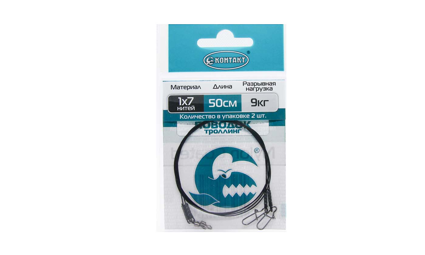 Каталог » ОСНАСТКА » Поводки » Поводок Контакт Тролинг » Поводок КОНТАКТ Троллинг 1х7 / Тест 9 кг / Длина 50 см (упаковка 2 шт.)