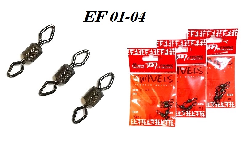 Extreme Fishing EF 01-04 – одинарные вертлюги; имеют бочкообразное тело с насечкой и петли крепления ромбовидной формы. Такая форма предотвращает смещение узла крепления основной лески или поводка по петле.
