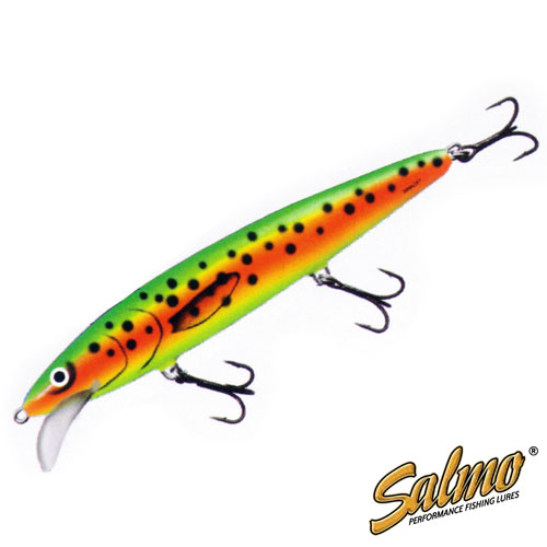 • Вид приманки – крэнкбейт• В ассортименте SALMO c – 2012• Предлагаемый размер (см) – 12• Предлагаемые типы – F• Рекомендуемый способ ловли – ТРОЛЛИНГ• Рекомендуется для ловли – щуки, судака, лососяЭта приманка создана для ловли троллингом лосося, форели,морской форели и судака. Этот воблер с схожей эффективностьюловит рыбу в течение всего периода открытой воды, так как вы можетенастраивать его игру под хоть какое настроение рыбы просто изменяя скоростьдвижения лодки. Его можно использовать как на мелководье, так и в болееглубоких местах – он отлично поднимает рыбу с глубины, а при установкеперед ним дополнительного груза (заглубителя, даунриггера) его можнопровести на любом подходящем вам горизонте. Невзирая на то, что приманка до этого всегопредназначена для ловли троллингом, она также отлично себя проявила при ловлевзаброс на бурных реках. Вогнутая лопасть придаёт воблеру соблазнительную хаотичнуюигру, заставляющую хищника терять голову
