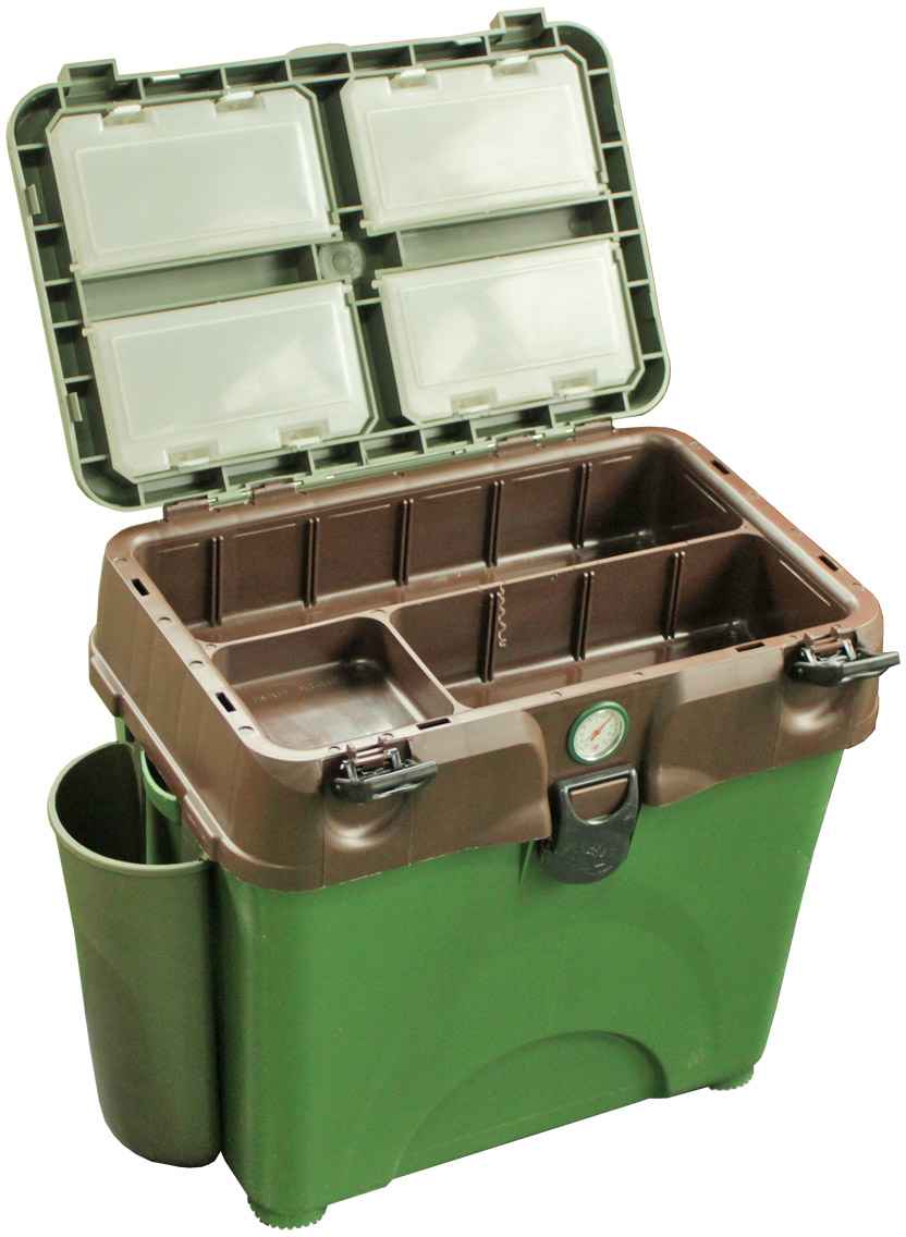 Изготовлен из прочного и морозоустойчивого пластика. В крышке ящика предусмотрены четыре отделения с прозрачными крышками для хранения насадки и мелких принадлежностей. Среднее отделение ящика имеет съемные перегородки, упрочняющие всю конструкцию и разделяющие отделение на отсеки для удобного хранения снастей. Нижняя емкость имеет съемную перегородку и позволит разместить крупные принадлежности или улов. Пластина из пенополиэтелена на крышке ящика не впитывает влагу и обеспечивает комфортное сидение. Дополнительно комплектуется съемными карманами и термометром. Габариты ящика: длина 41,5 см ширина 27 см, высота 38,5 см.
